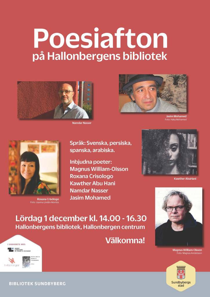 Vi vill föra samman nordisk poesi på olika språk och ge dig ett tillfälle att höra poesi i olika språkliga uttryck. Det är första gången unga finurliga poeten Kawther AbuHani, bosatt i Stockholm, läser sina arabiska dikter i Sverige med svenska översättningar.