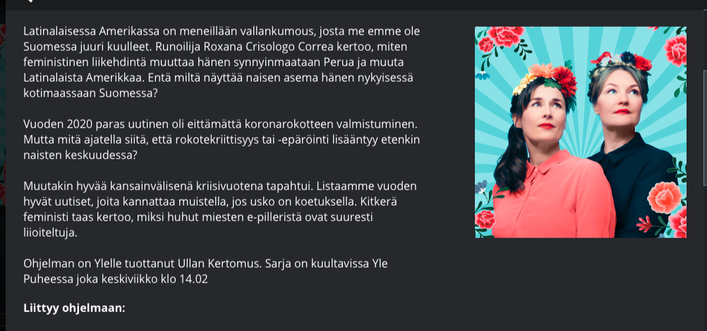 «Runoilija Roxana Crisólogo Correa iloitsee synnyinmaansa Perun ja muiden Latinalaisen Amerikan maiden feministisistä protesteista. Hän on mukana järjestämässä solidaarisuusmielenilmauksia myös Suomessa».