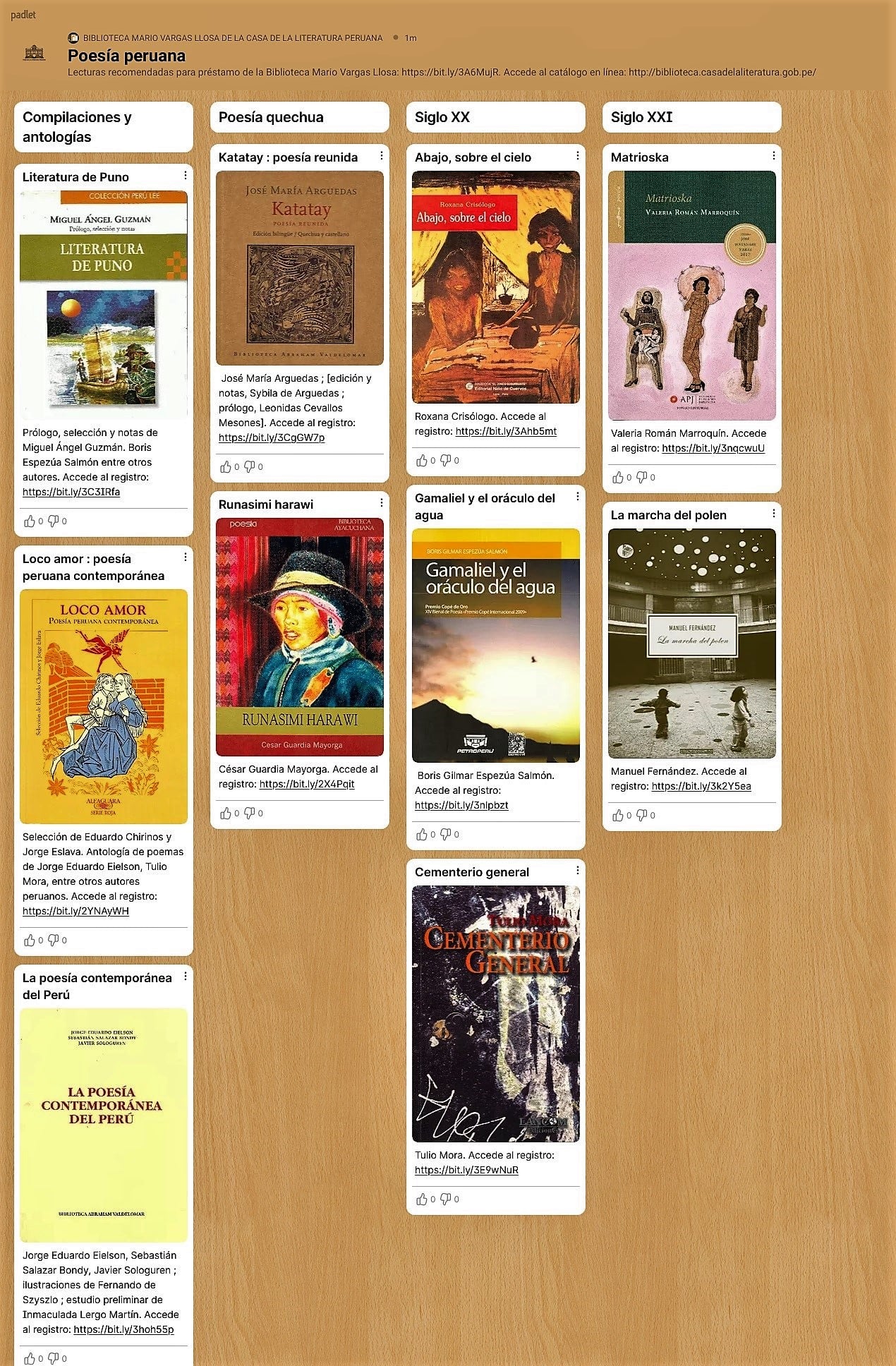 «Abajo sobre el cielo» mi primer poemario, publicado en 1999 por la editorial Nidos de cuervos en Lima, Perú, aparece entre los libros recomendados para préstamo a domicilio de la Biblioteca Mario Vargas Llosa de la Casa de la Literatura Peruana. Junto a mi libro se recomiendan también los importantes poemarios «Matrioska» de la gran Valeria Román Marroquín, «Katatay» de José María Arguedas y «Cementerio General» de Tulio Mora.