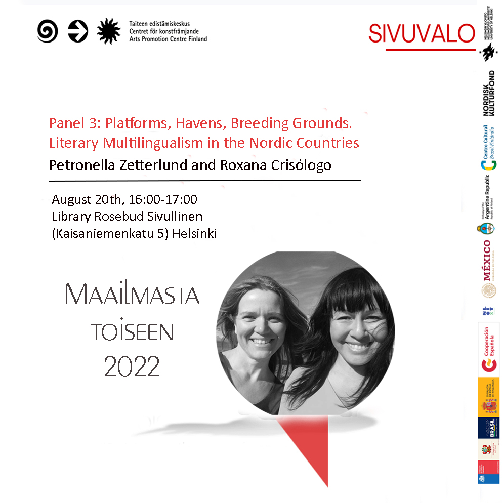 Maailmasta toiseen is a Spanish, Portuguese, and Finnish literature festival organized by the association Sivuvalo Platform Ry with the support of several Finnish and international institutions. Its purpose is to offer the Finnish public a view of contemporary poetry, fiction, and essay from the Iberian Peninsula and Latin America, and to promote the cultural exchange of these two realms with Finland’s literary and publishing circuit. This year the essay panel will take place in June, within the CEISAL conference at the University of Helsinki. The other panels are scheduled for August 19-20th at the University of Helsinki, Rosebud Bookstore, and Oodi Central Library.