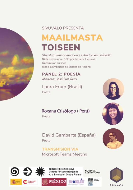 7.09.2020, 19:00 a 20:00 online https://us04web.zoom.us/s/8932834890 Debate about multilingualism, with Tanya Tynjälä (writer), Roxana Crisólogo Correa (poet, founder of «Sivuvalo … Más